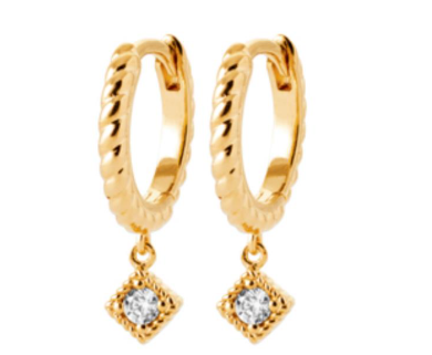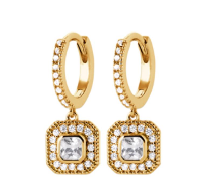 BOUCLES D'OREILLES Dame créoles empierrées et pampilles carrées PLAQUE OR