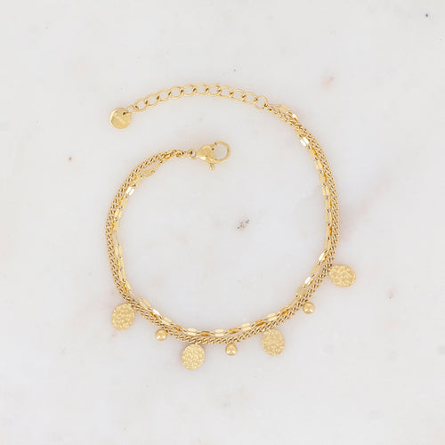 BRACELET Dame acier doré DOUBLE RANG AVEC PAMPILLES OVALES MARTELEES