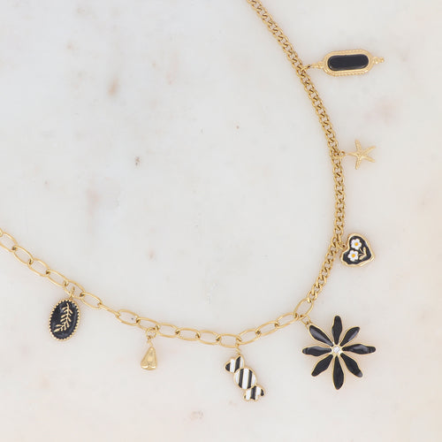 COLLIER Dame Acier doré MAILLE OVALE PAMPILLES EMAILLEES NOIR ET BLANC