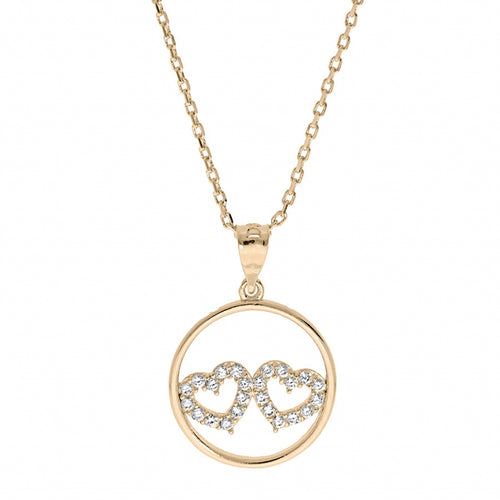 COLLIER Dame pendentif rond avec 2 coeurs zirconium PLAQUE OR