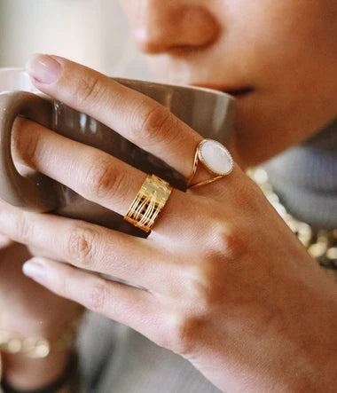 Bague ajustable en acier inoxydable doré à l’or fin sertie d’un cabochon de pierre fine.