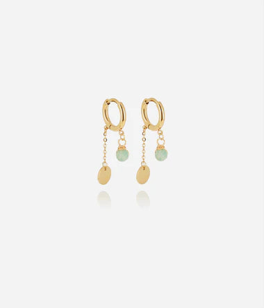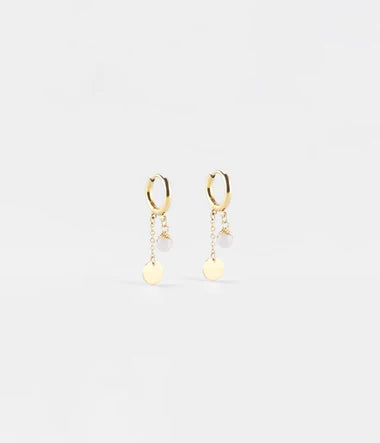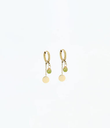 Petites créoles en acier doré à l'or fin par ionisation sur lesquelles pendent deux petites chaînettes, l'une terminée d'une bille de pierre naturelle ( péridot ou agathe blanche) et l'autre, d'une petite médaille.
