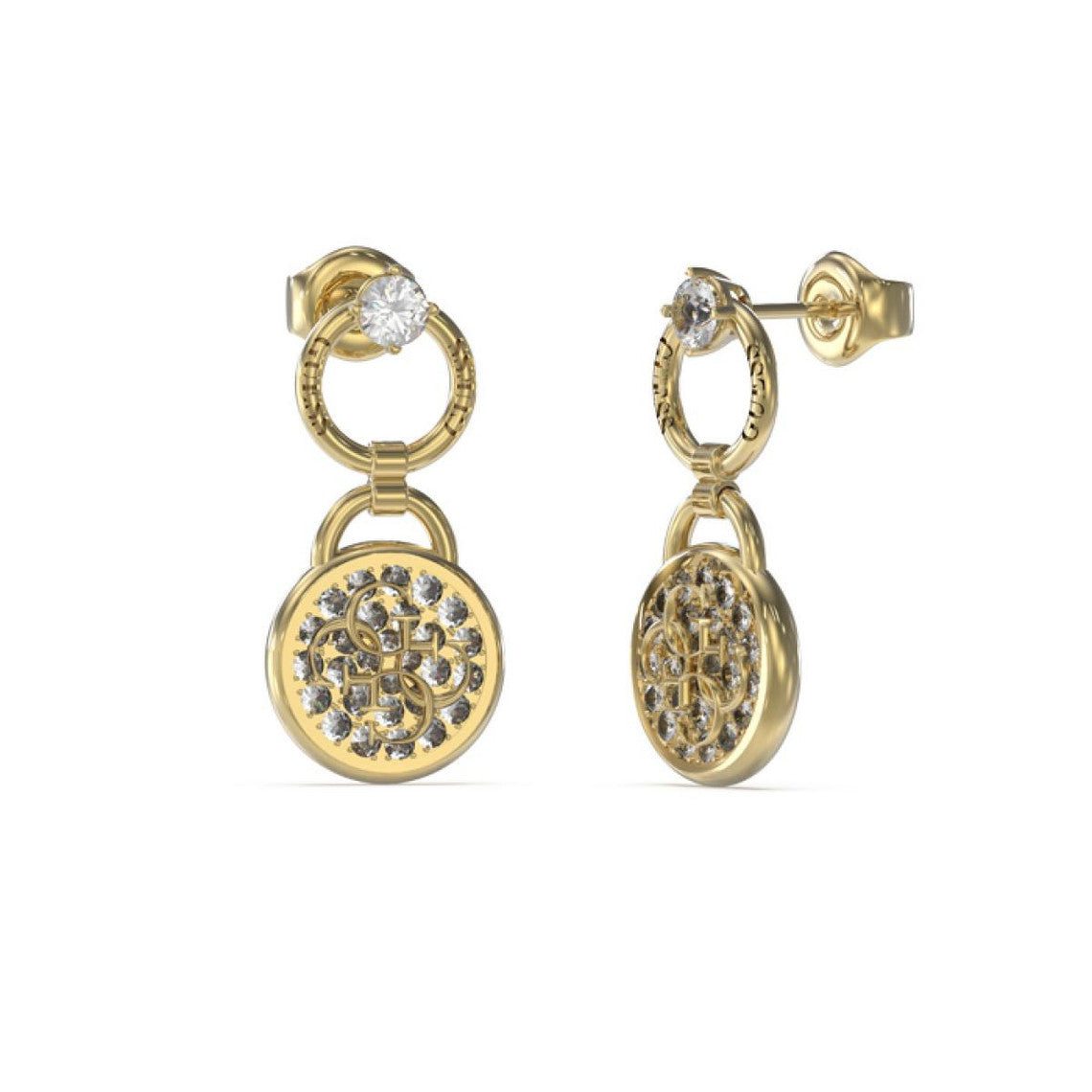 Affichez un look tendance avec ces Boucles d'oreilles Guess Bijoux DREAMING GUESS Acier Doré. Authentiques, elles arborent les fameux logos 4G posés sur un médaillon design. La base est ornée de strass pour une touche scintillante.
