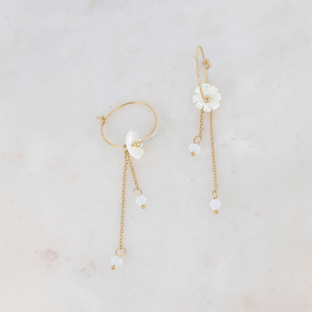 Boucles d'oreilles type créoles en acier doré composées d'une fleur nacrée et de chaînes pendantes ornées de cristaux taillés.