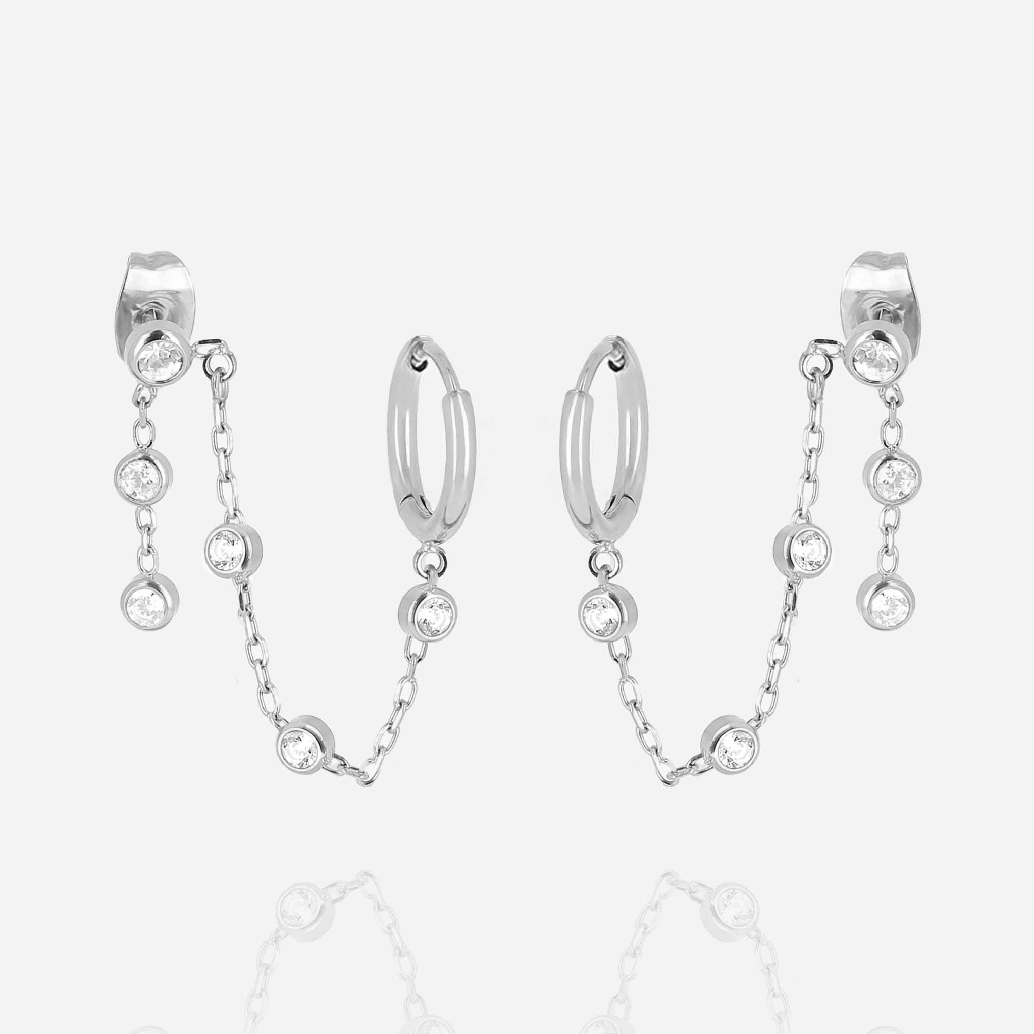 Boucles d’oreilles double en acier uni ou doré à l’or fin par ionisation. Le premier piercing puce est serti d'un zirconium, l'autre est une petite créole, les deux sont reliés par une chainette sertie de zirconiums.