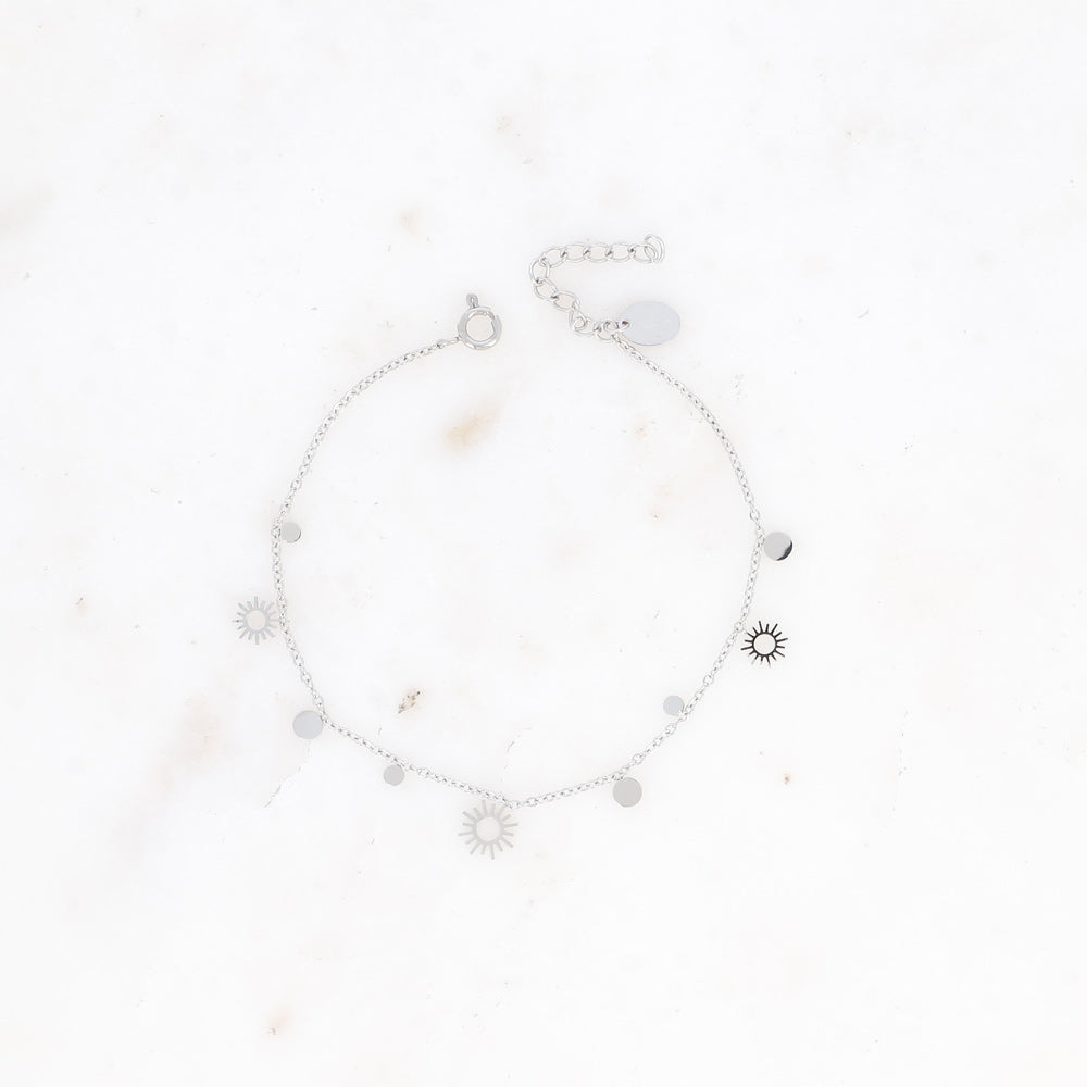 Bracelet sur chaîne en acier inoxydable composé de pastilles rondes plates et de pampilles soleil ajouré.