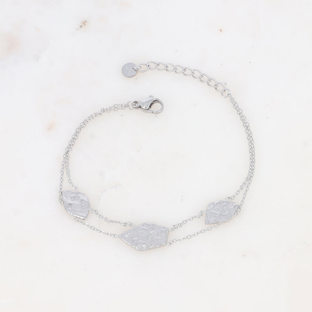 Bracelet double rangs sur chaîne composé de pampilles géométriques martelées. Fermoir mousqueton et chaînette réglable Matière : Acier inoxydable. Hypoallergénique, ce bijou résiste à l'eau et ne noircit pas. Dimension: 16+3 cm.