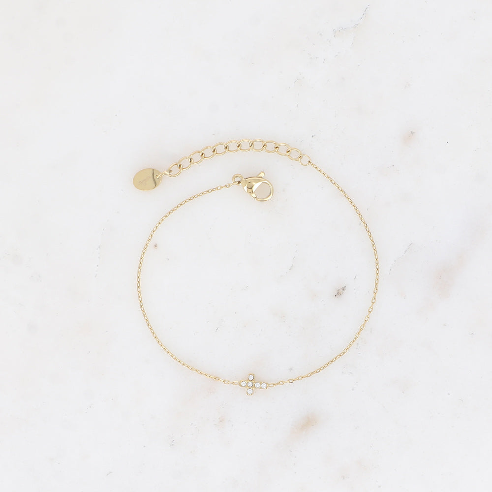 Bracelet sur chaîne en acier inoxydable doré ou argenté composé d'un pendentif en forme de croix sertie d'oxydes de zirconium