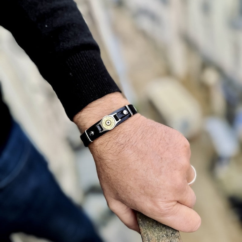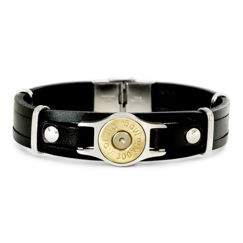 Bracelet composé de 3 lanières en cuir véritable, surmontées d'une véritable douille de calibre 300 MAG. Chacune des douilles est percutée et unique.