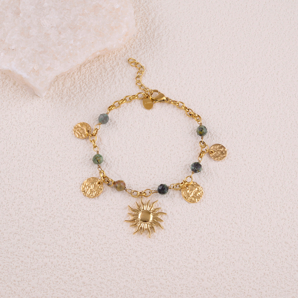 Bracelet sur chaîne en acier inoxydable composé de pierres naturelles( Turquoise Africaines), de pampilles rondes martelées et d'un pendentif en forme de soleil.