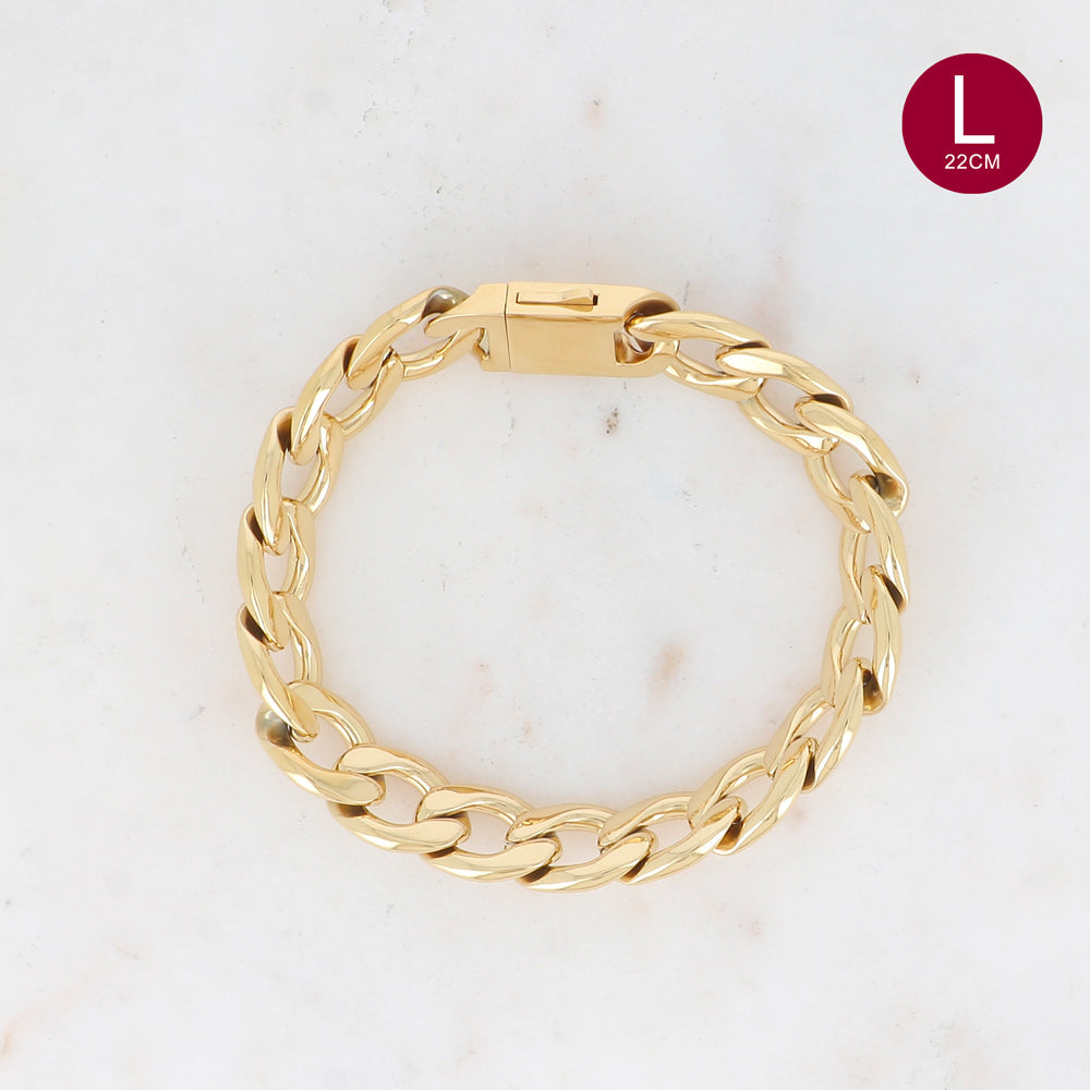Bracelet en acier inoxydable composé d'une maille gourmette large et d'un fermoir à double pression. Longueur du bracelet: 22 cm Epaisseur de la maille : 1,3 cm