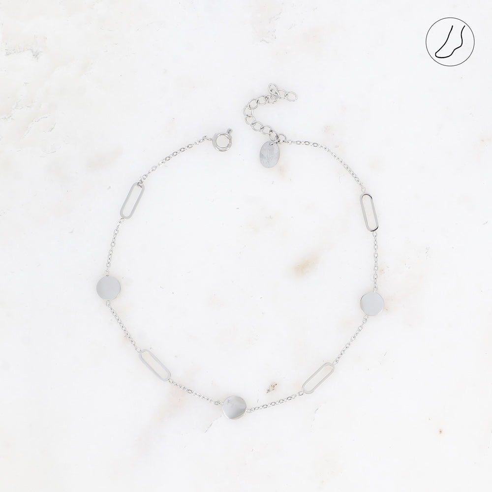 Bracelet de cheville sur chaîne en acier inoxydable composé de pastilles rondes plates et d'ovales allongés ajourés.