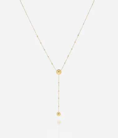 Collier en acier inoxydable uni ou doré sur lequel sont parsemées des petites boules d'acier. Une demi sphère est attachée au centre et une chaînette y est suspendue au bout de laquelle se trouve une autre demi sphère.