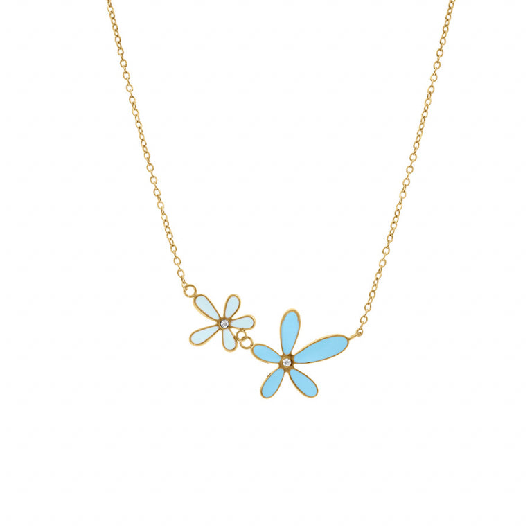 COLLIER Dame fleurs bleues turquoise ACIER DORE