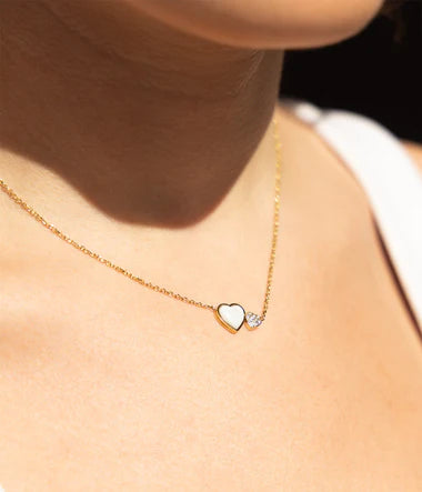 Collier en acier uni ou doré à l’or fin par ionisation serti d'un cœur en nacre ainsi que d'un anneau serti de zirconiums.