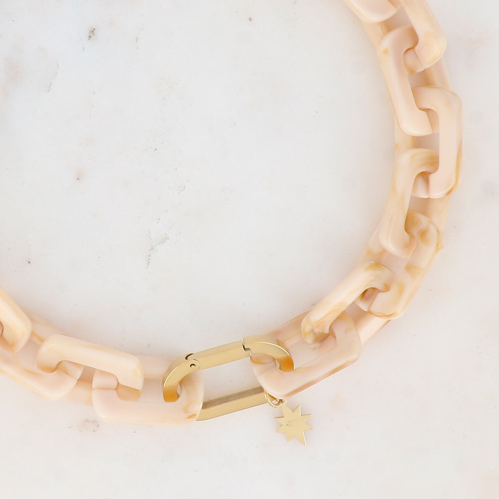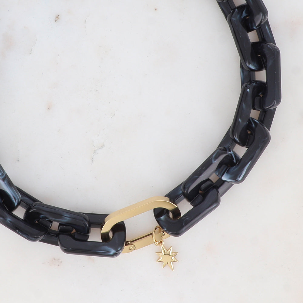 Collier en acier inoxydable composé d'une petite étoile, d'un mousqueton ovale et de résines rectangulaires colorées.