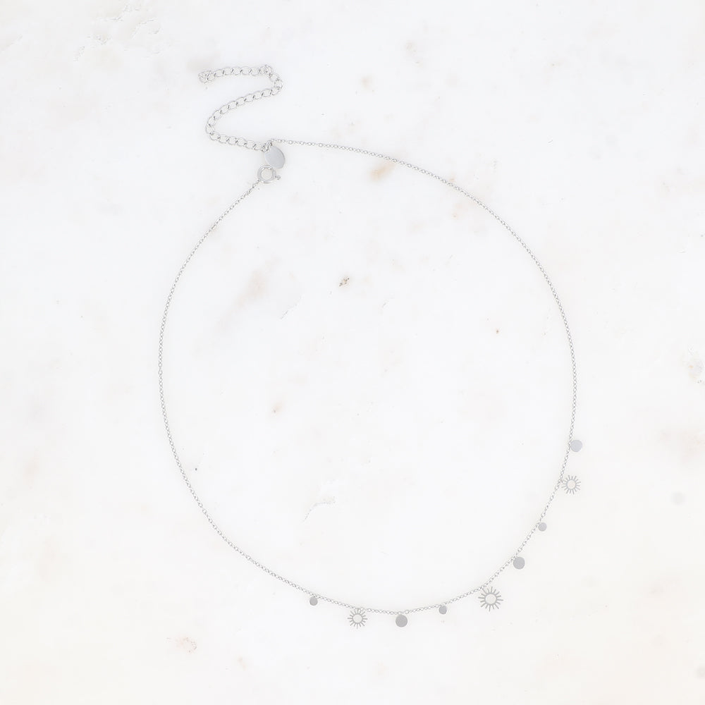Collier sur chaîne en acier inoxydable composé de pastilles rondes plates et de pampilles soleil ajouré.