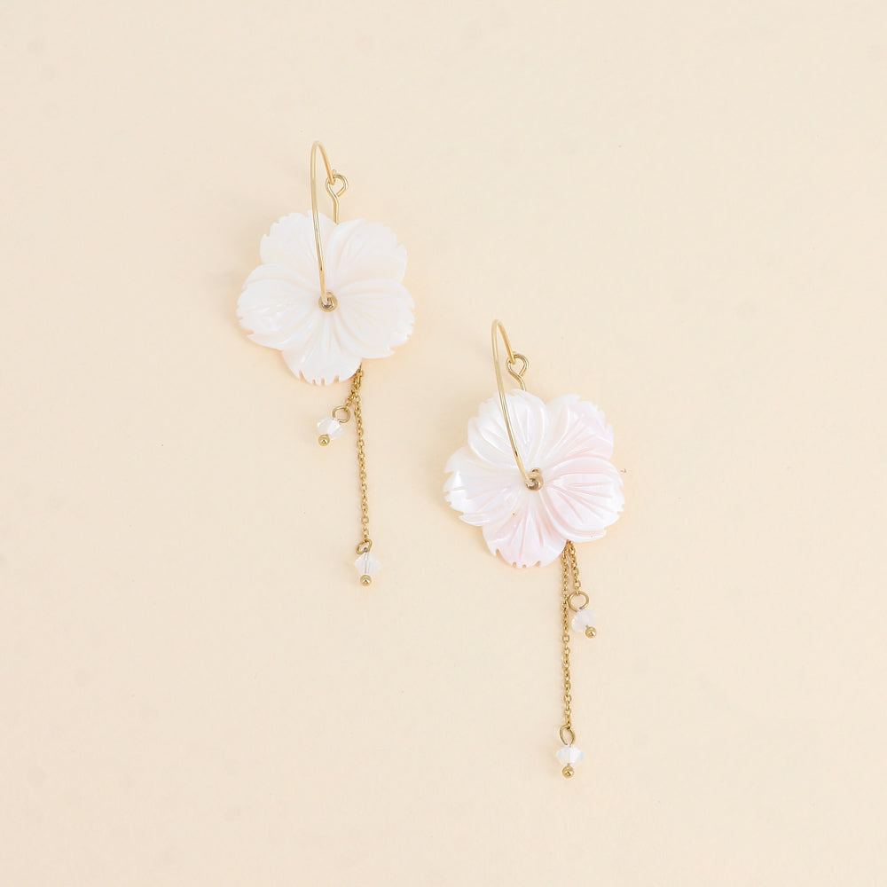 Boucles d'oreilles type créoles composées d'une créole en acier inoxydable avec fleur nacrée plus deux chainettes pendantes ornées de cristaux toupies